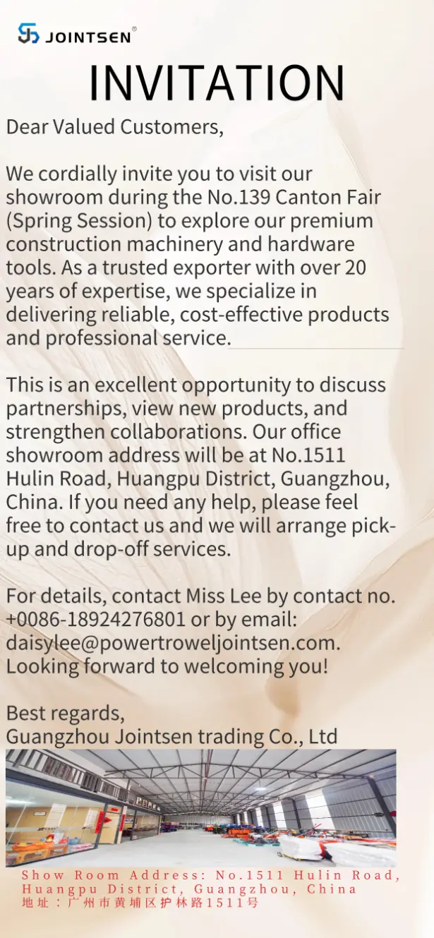 We cordially invite you to visit our showroom during the No.139 Canton Fair (Spring Session) to explore our premium construction machinery and hardware tools. As a trusted exporter with over 20 years of expertise, we specialize in delivering reliable, cost-effective products and professional service.